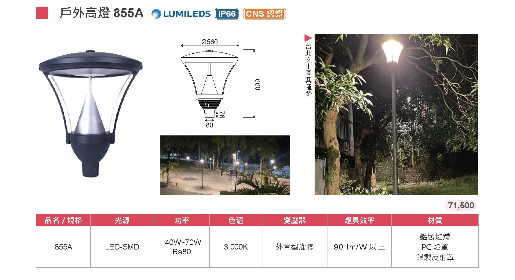 ▶【堅固防護結構】鋁製燈體搭配鋁製反射罩與 PC 燈罩,通過 IP66 與 CNS 認證,具備良好防水、防塵與耐候能力。